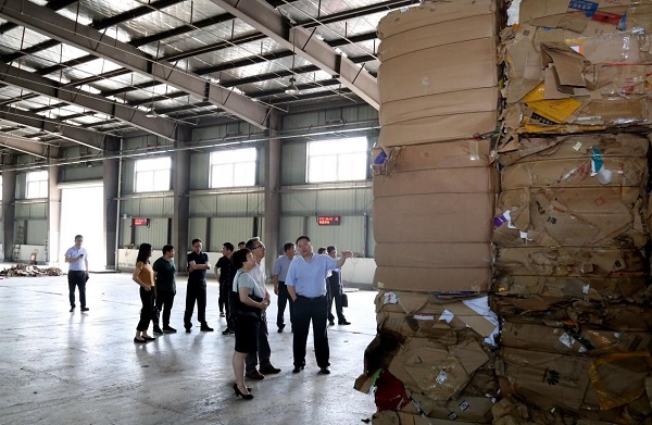 集团领导首先参观了六合基地内的两个厂房,询问了目前六合基地每天的废纸收购量及市场行情,并对厂区的生产消防安全工作提出要求。随后,集团领导一行与纸联公司负责人就纸联公司“不忘初心、牢记使命”主题教育活动开展情况进行深入研讨。纸联公司党总支书记、董事长陆明灿汇报了公司上半年党建纪检工作情况、经营指标完成情况、六合基地运营情况以及目前遇到的困难,并对目前废纸行业情况进行了分析。